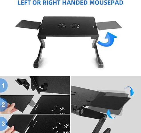 - 🔧❄️ Adjustable and Easy to Assemble: Equipped with 2 powerful cooling fans, our Lap Top Desk rapidly releases heat during work. Easily adjust the angle of the legs by pressing the button to find your ideal working height. The mouse pad is conveniently reversible on both sides.